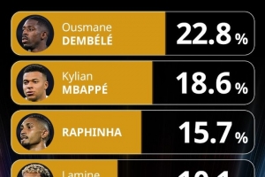 环足奖最佳球员投票:姆巴佩29.9%领跑,拉菲尼亚、登贝莱前三