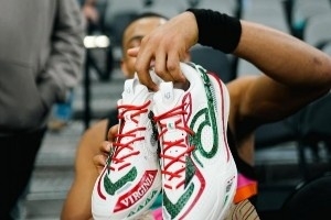 球鞋的配色也采用了圣诞经典的红绿配色,大概率他将会在明天的圣诞大战中穿着此双球鞋。