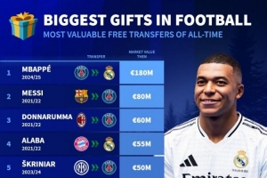 免签球员德转身价排名:姆巴佩1.8亿欧居首,梅西8000万欧次席