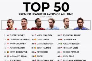 你认可吗🤔外媒评英超历史50大球星:亨利第1 C罗第2 萨拉赫第6