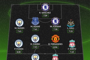 中场:福登(曼城,8.00分)、谢尔基(曼城,7.97分)、B费(曼联,8.06分)、维尔茨(利物浦,7.65分)
