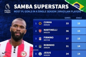 巴西球员英超单赛季进球排行榜:24/25赛季库尼亚33场15球第一