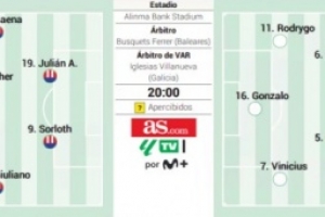 体育资讯1月8日讯 北京时间1月9日3点,西超杯半决赛,皇马vs马竞,《阿斯报》赛前预测双方首发,贡萨洛对决阿尔瓦雷斯,维尼修斯、贝林厄姆出战。