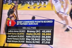 本场比赛过后,库里总得分26240,父子组合总分38910,距离詹姆斯父子还差3782分。