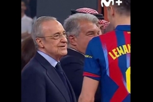 在颁奖环节,摄像机也捕捉到了皇马主席弗洛伦蒂诺和莱万之间的互动。《世体》指出,弗洛伦蒂诺在与莱万多夫斯基握手时,则流露出既钦佩又无奈的复杂神情。 皇马主席面带微笑地向这位波兰球员打招呼,并含蓄地称他为“混蛋”,以此来表彰这位37岁高龄却打进精彩进球的波兰球员的实力。莱万多夫斯基听到后也露出了笑容。