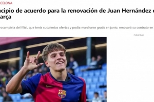 每体:巴萨即将续约B队小将胡安·埃尔南德斯,预计未来几天官宣