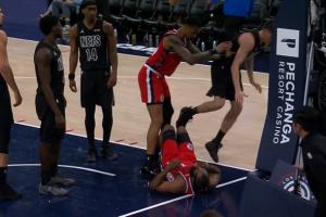 GIF-杰明保护哈登 科林斯误会了 直接推飞杰明 曼恩也推了科林斯一把 双方技犯