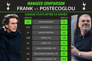 危?弗兰克执教热刺前16轮胜率、进球等数据均不如澳波上赛季同期