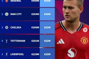 体育资讯12月16日讯 德转盘点了英超Big6球队防线平均身价榜(不包括门将),其中阿森纳高居榜首,具体如下(防线总身价+平均身价):