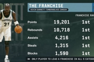 以上5项数据全部队史第一,加内特为NBA历史唯一